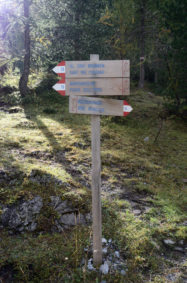 Questa escursione parte dal sentiero nr. 10 (nei pressi del Campeggio di Trafoi) o sentiero nr. 13 (nei pressi dell'ex Centro Montano della Polizia di Stato). Nel primo caso seguite sempre le indicazioni, ad un certo punto il cartello che segna il sentiero nr. 10 si dirama in due direzioni. La direzione destra porta alla Rocca Bianca, quella sinistra al Ponte dell'Orso, da qui poi prosegue sul sentiero nr. 13.