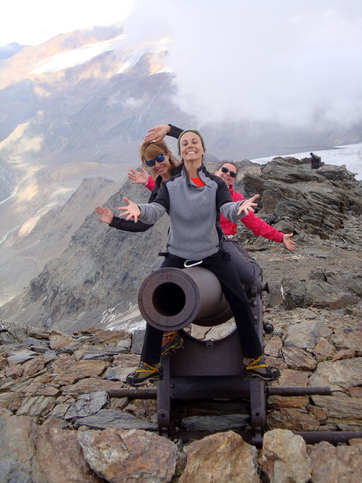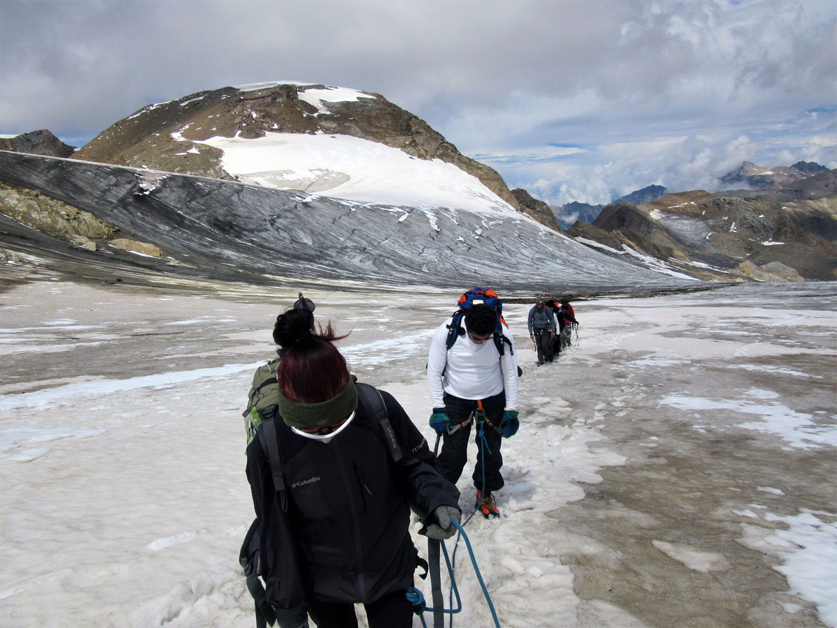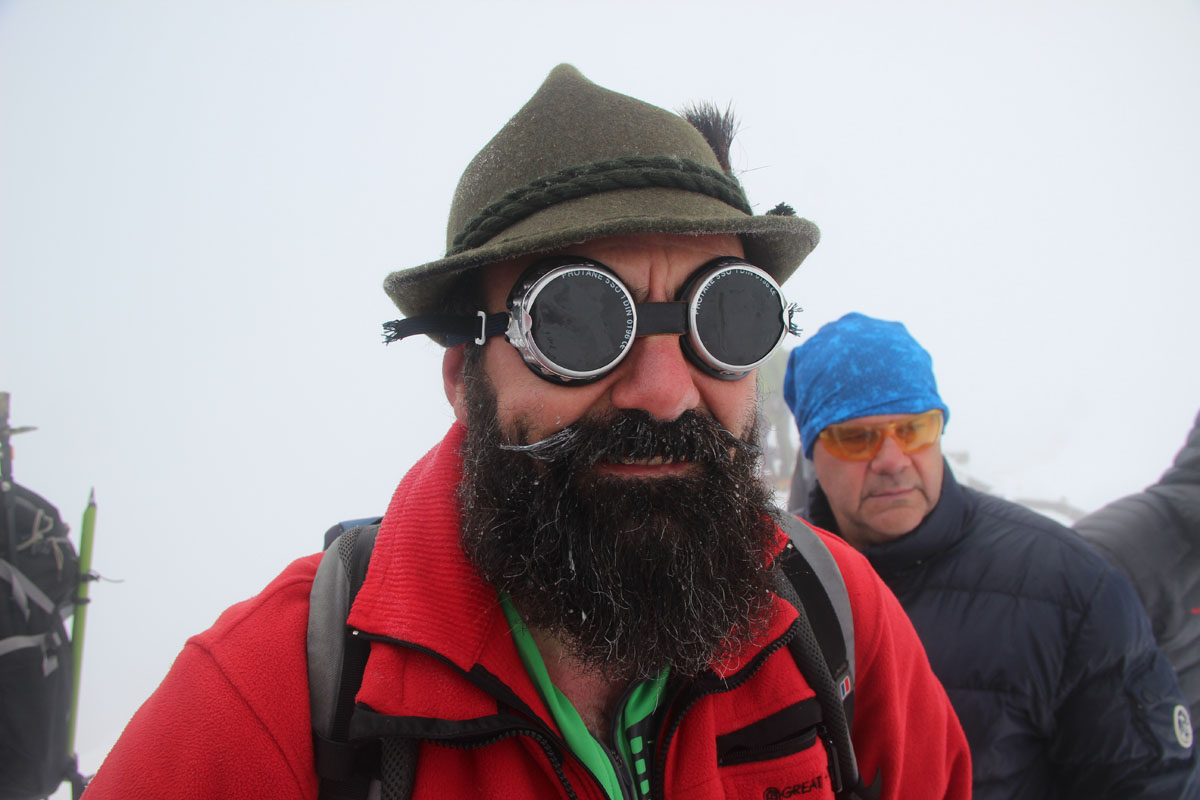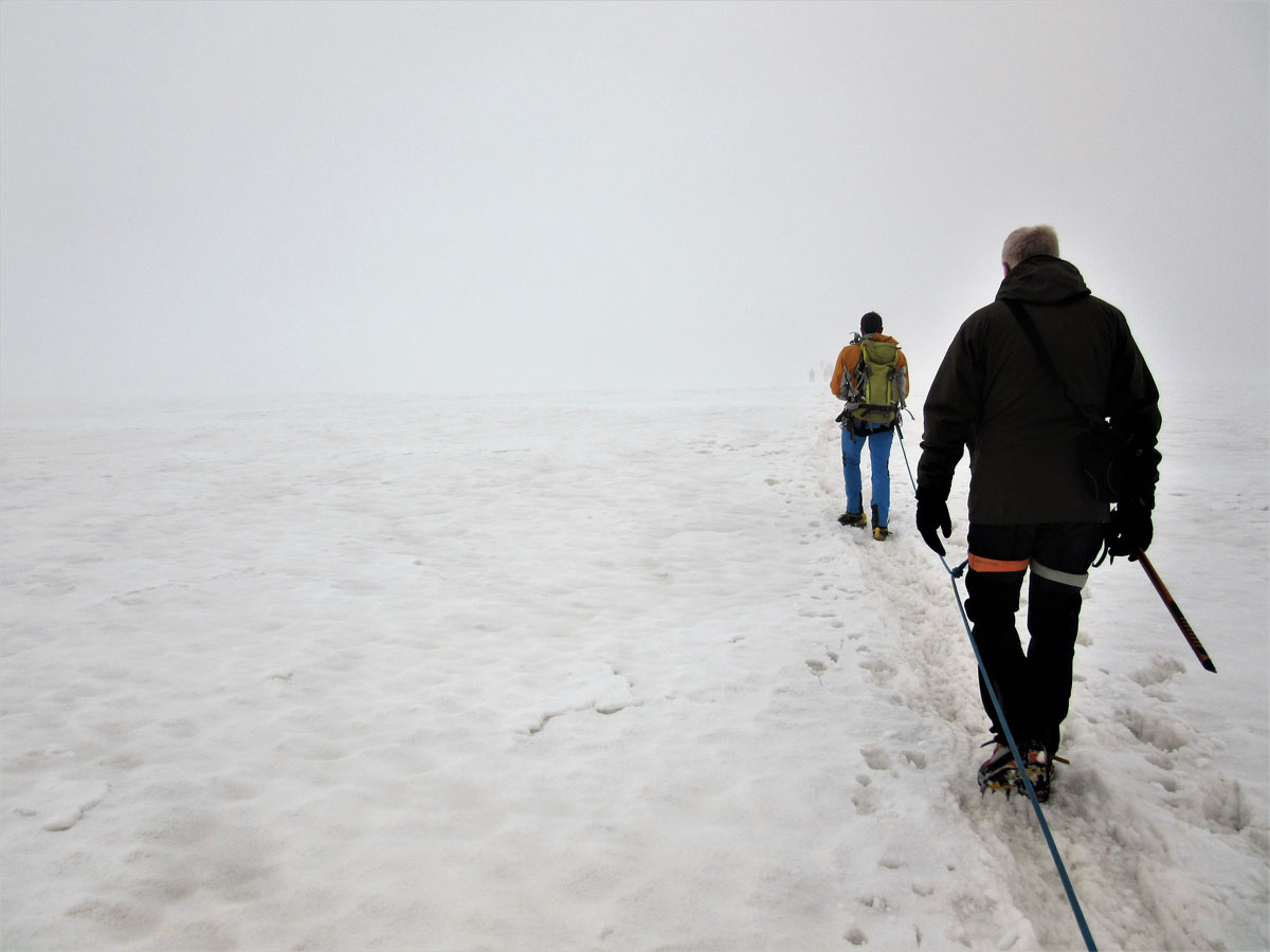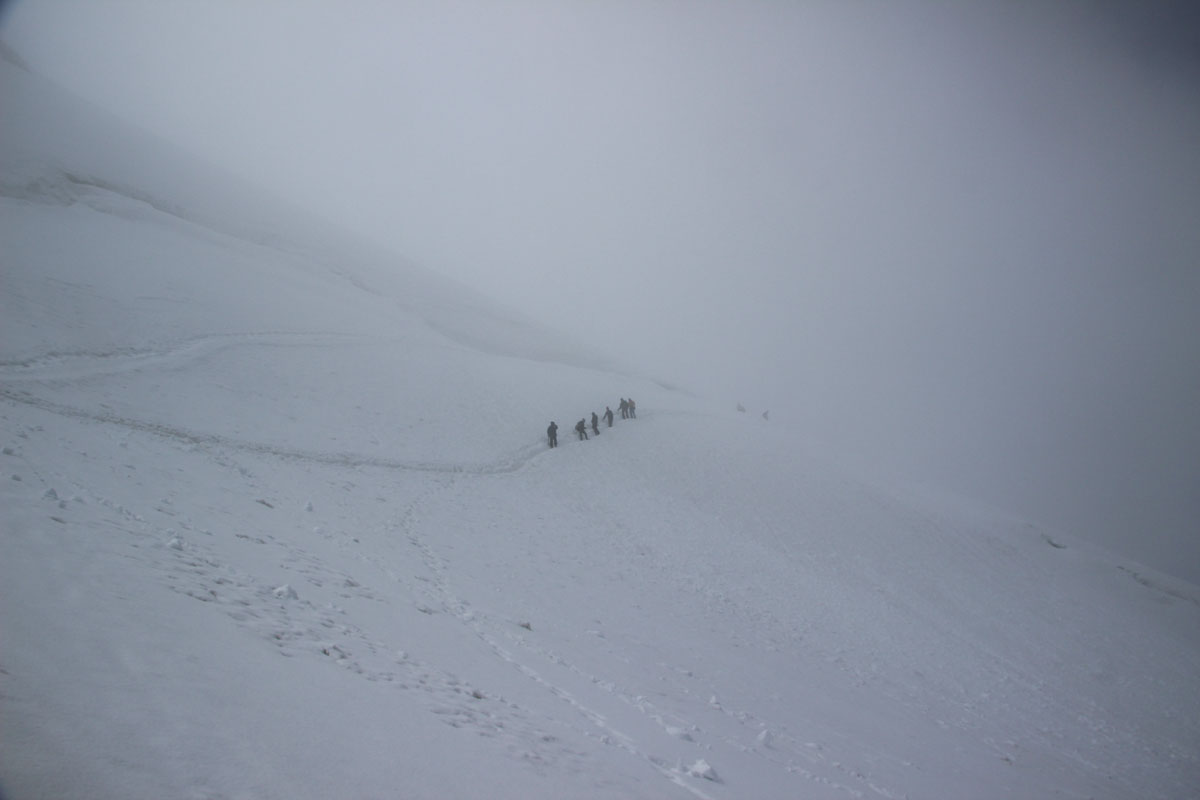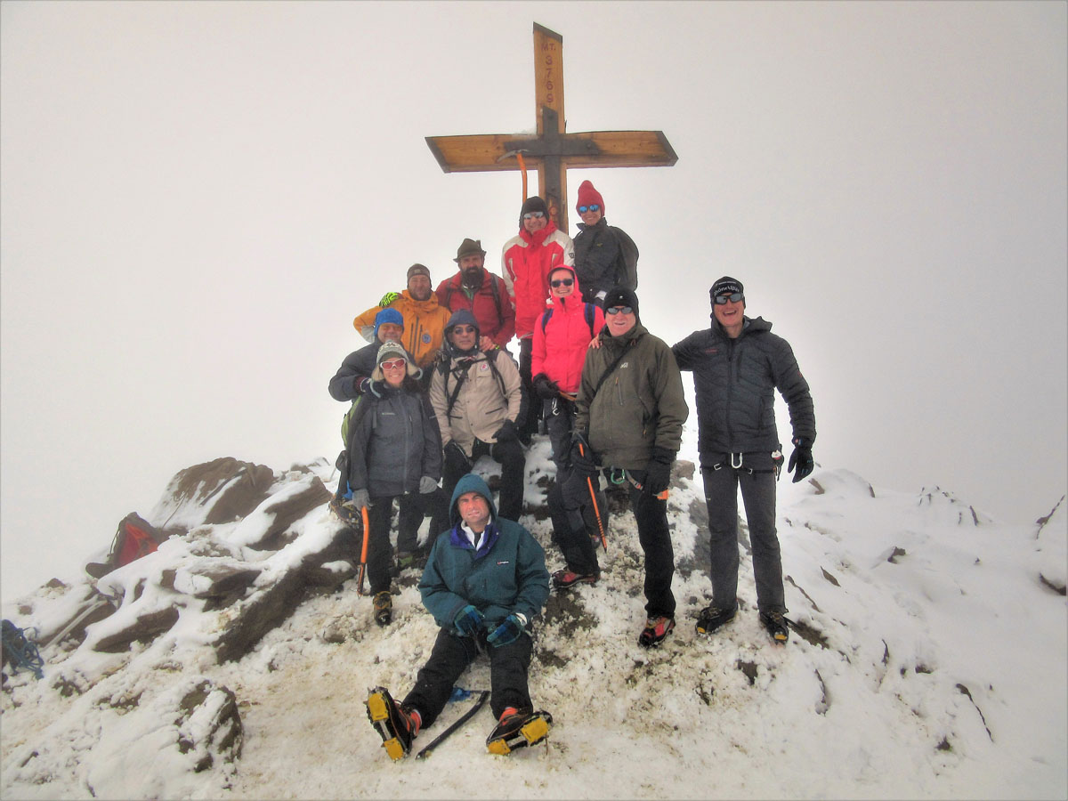Sveglia alle 05.45, colazione e partenza alle ore 07.00. Il tempo è nuvoloso, ma non sono previste precipitazioni. Si parte convinti che il cielo regalerà una bella escursione, la prima ora camminiamo abbastanza bene e riusciamo a guardare anche il panorama circostante, appena inizia la salita, però, le nuvole e la temperatura si abbassano. Si continua a camminnare. Riusciamo a malapena a vedere i compagni di cordata davanti e dietro, incrociamo qualcuno che scende e dice che manca poco. Purtroppo ci rendiamo conto di essere arrivati in cima soltanto vedendo la Croce. Poco prima vi sono i resti di una capanna di guerra, che fino a qualche anno fa era coperta dal ghiaccio. Giusto il tempo per qualche fotografia, poi si scende perchè c'è molto freddo. |